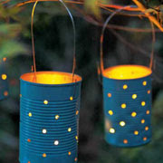 These lanterns are made from a tin can with holes pounded through with a hammer and nail. These can be very fancy, or quite plain, but when lit they look like little stars shining through (fill the can with water and put it in the freezer before hammering, so you don’t crush the can):
