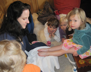 On days when I feel wiped out, I implement “Take Care of Faith Collins” days. I lower the lights. I pull the curtains. When the children come in, I tell them in a soft voice, “Today’s gong to be a quiet day. Today will be a day when YOU take care of ME!” I lie down on the couch, or in the cozy corner that’s loaded with lambskins and cushions. The children bring over blankets and silks and ‘tuck me in.’ They bring over the dollies and tuck them in with me. They bring over books, and we take turns where they read one to me, then I’ll read one to them. We play the kinderharp. We brush hair and give lavender foot-baths. We drink warm chamomile tea. Take Care of Faith Collins days are days for snuggling, and they are sweet and soft. I talk more softly, more slowly than usual. Things I normally do myself, I ask the children to do for me, and they love to rise to the occasion.