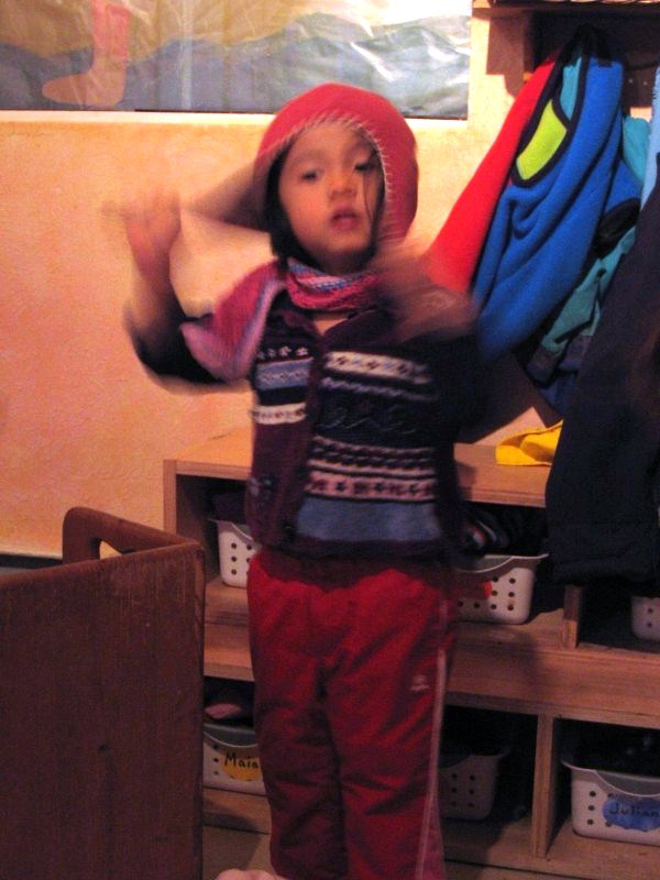 So, what are young kids capable of at different ages? When should it go from being something that you lure them into, to something that is simply expected? My experience is that adults tend to underestimate what one- and two-year-olds can do, and overestimate what three- and four-year-olds can do. What do I mean by that? Well, with the littler ones, we often simply don’t create the space or even have an idea of what a little one can do. Their skills are growing so quickly at this age, that we often treat them as an infant when they are in fact capable of much more. As young as 18 months, a young child can take her bowl from the table, scrape her food into a compost-tub, and put her bowl and spoon into a wash-tub. I had a class of 8 one- and two-year olds, and they all did this after every meal! When a child first came to me, I would stand behind him and help him reach out his hand to get his bowl. Then I would point out the compost-tub, and walk over with him. Kneeling behind him, I’d put my hands around his to grasp the spoon and scrape out the food. Then I’d point out the wash-tub and he could put his bowl and spoon in by himself. After five or six times of literal ‘hands-on’ help like this, most kids became quite competent!